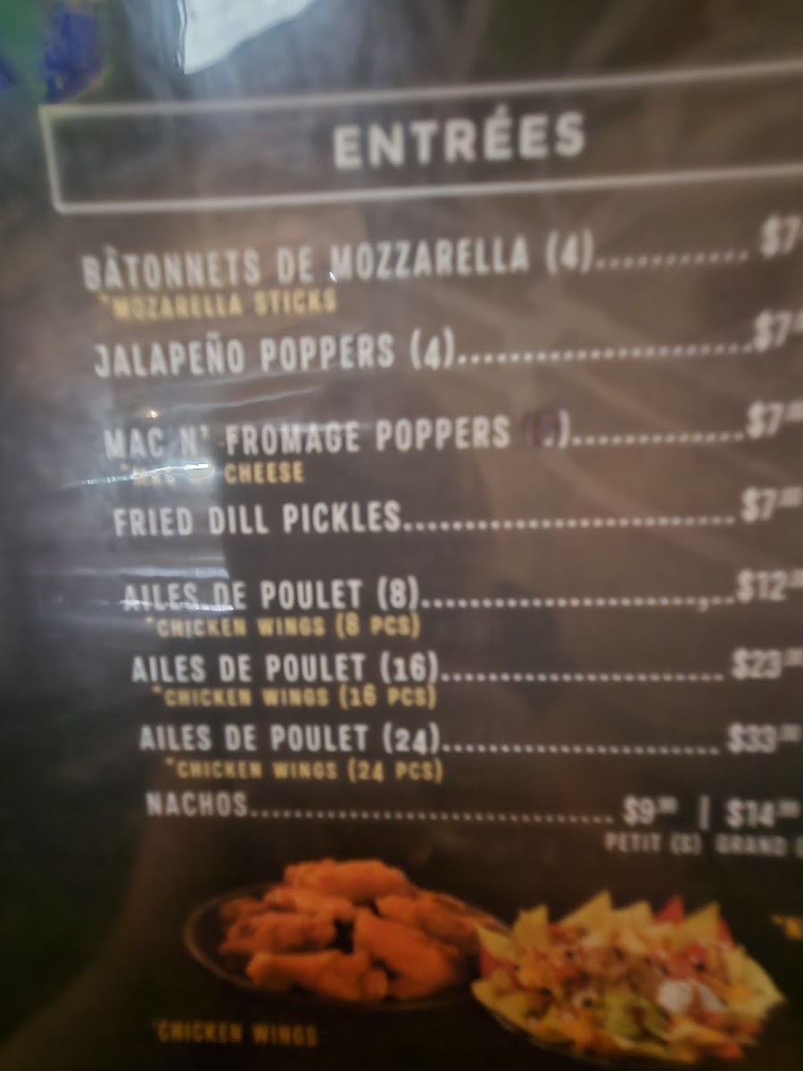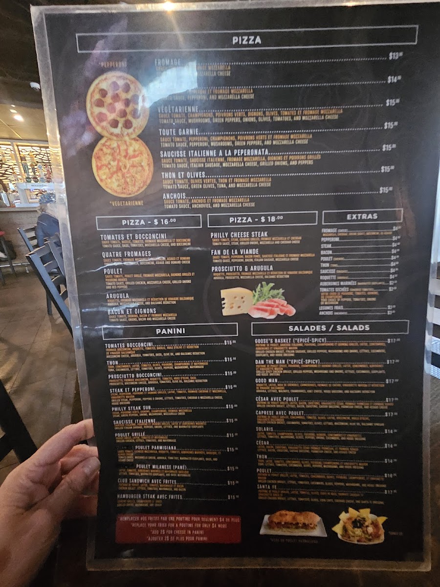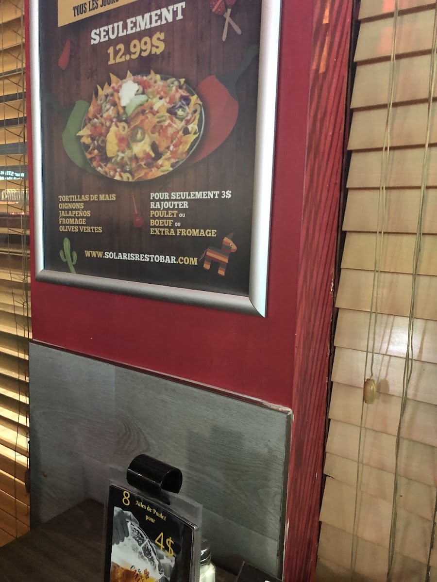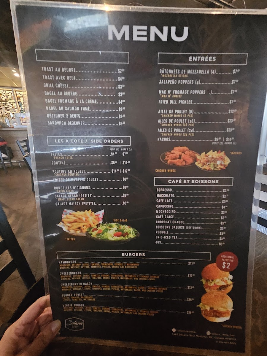 Solaris Resto-Bar’s menu delivers a diverse mix that caters to both hearty appetites and lighter cravings. The salad selection impresses with options like Santa Fe, Steak Caprese, and the spicy Dan The Man (Épicé), alongside the classic César Avec Poulet, offering fresh, well-balanced flavors. Breakfast enthusiasts can enjoy comforting choices such as Sandwich Au Fromage Grillé, BLT Sur Pain Grillé Ou Bagel, and Oeufs Au Steak Philly, each showcasing generous portions. The burger lineup spans from the classic Hamburger to the indulgent Burger Au Fromage Et Bacon, as well as Hamburger Végétarien and Burger Poulet, appealing to meat-lovers and vegetarians alike. Appetizers are playful and shareable, including Ailes De Poulet (16) or (24), Jalapeño Poppers (4), Bâtonnets De Mozzarella (4), and crispy Cornichons Frits À L'aneth. Pizza offerings are extensive and well-priced, with options like Philly Philadelphie, Prosciutto Et Roquette, and Fan De La Viande ranging from $19-20.00, while simpler choices like Quatre Fromages, Poulet, and Bacon Et Oignons come in at $18.00. Paninis satisfy with fillings like Tomates Bocconcini, Sous-Marin Au Steak Philly, and Saucisse Italienne, providing both light and indulgent alternatives. Side orders such as Popcorn Chicken, Rondelles D'oignons, Salade Maison (Petite), Frites, and Poutine round out the menu, ensuring each meal can be tailored to appetite and taste. Beverages complement the food with familiar comforts like Cappuccino, Boissons Gazeuses, Thé Glacé Brio, and Chocolat Chaude, offering a satisfying finish. Overall, Solaris Resto-Bar presents a menu that balances classic comfort foods with creative twists, giving diners a well-rounded culinary experience that is both approachable and flavorful.